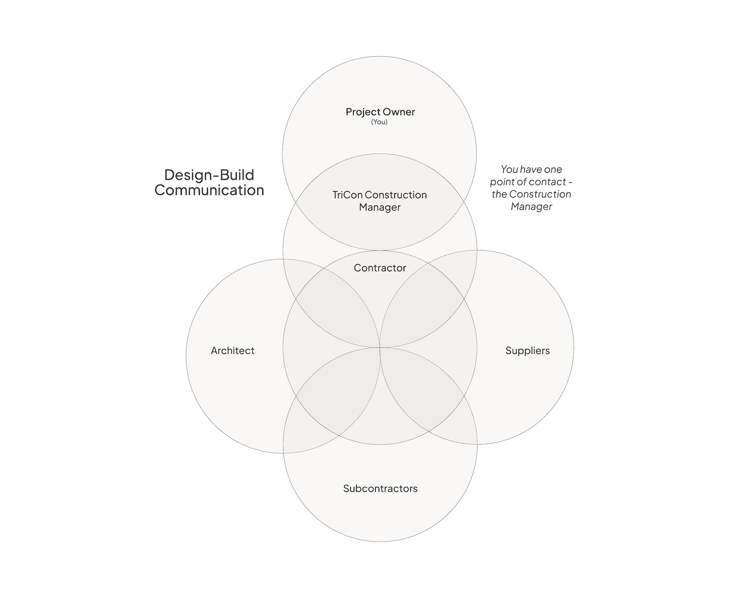 As Construction Managers, TriCon Builder's Design-Build method also puts the Project Owner (probably you) in a great place to be involved at the appropriate times with the appropriate people. We understand you hired us to be construction experts so you don't have. You will maintain a single point of contact from start to finish. They will consult with you and keep you informed for the duration of the project.